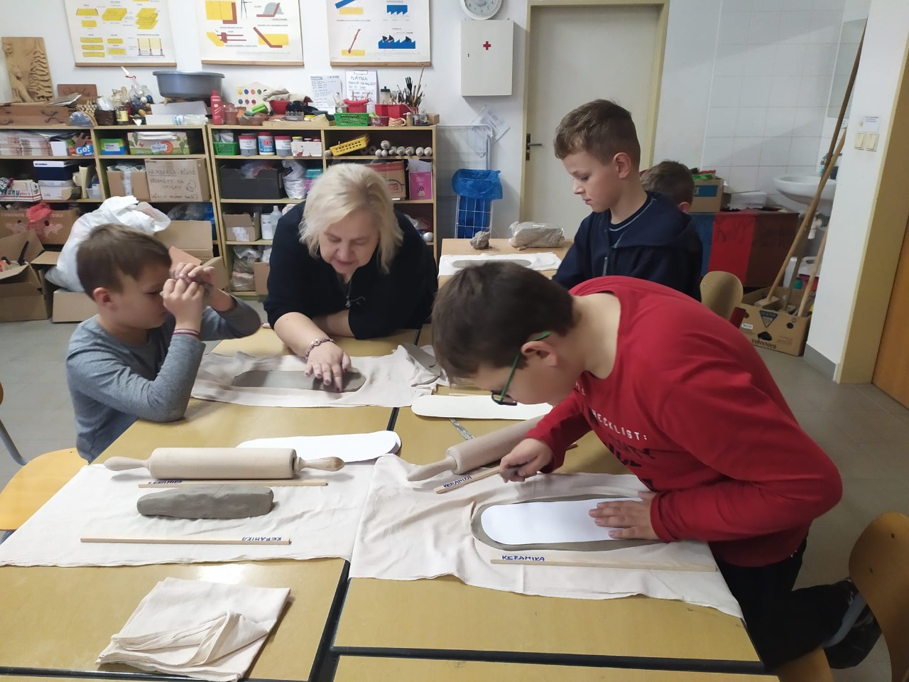 Vyzkoušeli jsme si vyrábění včelích venkovních teploměrů, které si potom můžeme umístit na naši včelnici. Za pomoci pí. Hanky Hájkové jsme teploměry zasadili do hliněné destičky a ozdobili včelařskými motivy.